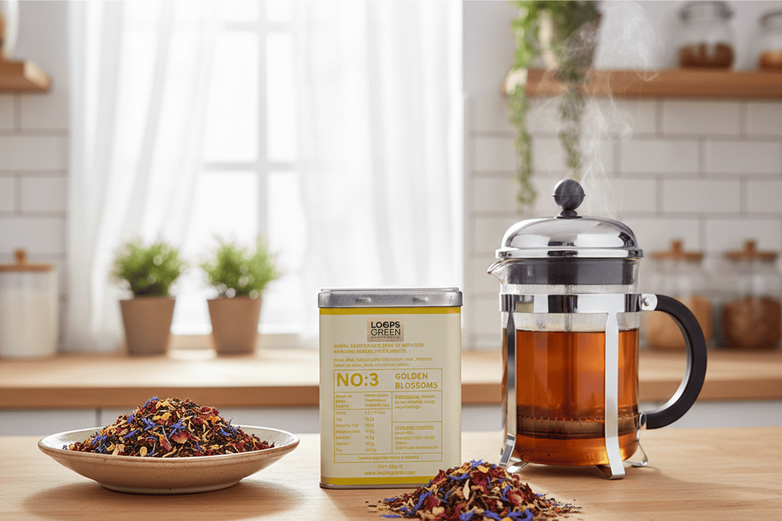 Saf organik bitki çayı. Sarı ve mor çiçeklerle zenginleştirilmiş özel harman.