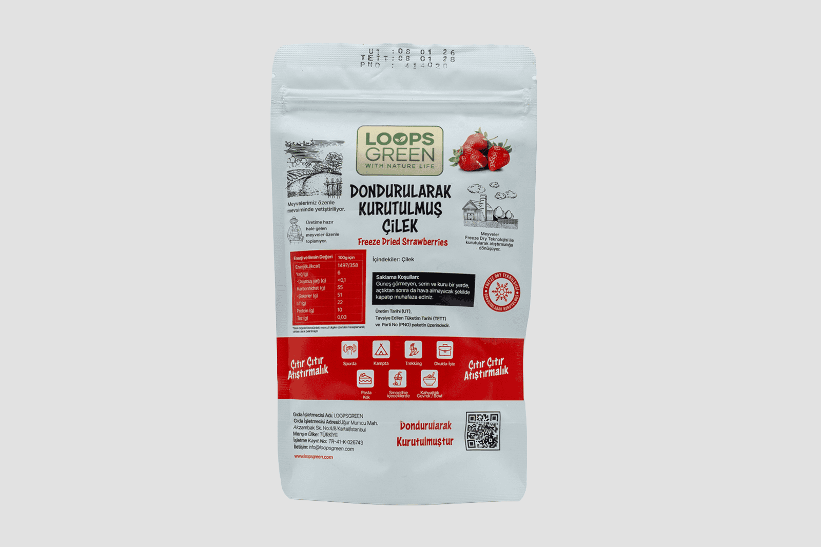 Dondurularak kurutulmuş doğal çilek. Yoğun aroma, çıtır doku.
